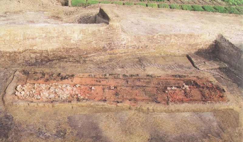 墓葬位于土墩近中部,墓葬为平地起封,其营造方式是在表土上铺垫墓台,墓台上置放木料构筑墓床,墓床长16.68、宽5.07米,方向110°。墓床上置放墓主和随葬器物,然后进行封土;该墓在封土完成后通过人工挖洞在墓葬上方对封土进行焚烧,使墓室上方形成了厚达2.5米的大范围的红烧土。