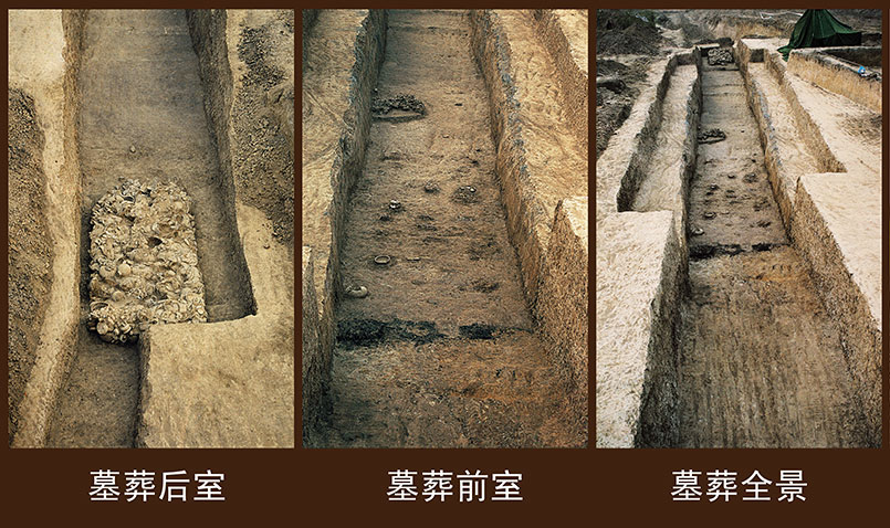 The tomb is located near the middle of the mound. The construction method of the tomb is to pile soil in the West and north of the mound, lengthen and widen the original mound to form a rectangular mound in the east-west direction. Then, the tomb pit is excavated in the middle of the mound. The plane of the tomb pit is in the shape of "middle", 56.7 meters long, 6.3 meters wide and 3 meters deep, which is divided into the tomb passage, the tomb chamber and the back chamber There is an oblong niche on the south wall of the passage, and a drainage ditch at the bottom of the passage and at the back of the back chamber.