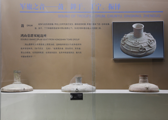 鼓是春秋战国时期战争中最常见的乐器,诸侯之间的战争中用鼓为号为必不可少,鼓声是战争过程中进攻的信号和象征。鸿山遗址出土的悬鼓座上用双头蛇,这种独特的设计与战争指挥和战术密切相关。《孙子兵法•九地》:“故善用兵者,譬如率然。率然者,常山之蛇也。击其首则尾至,击其尾则首至,击其中则首尾俱至。敢问兵可使如率然乎?”